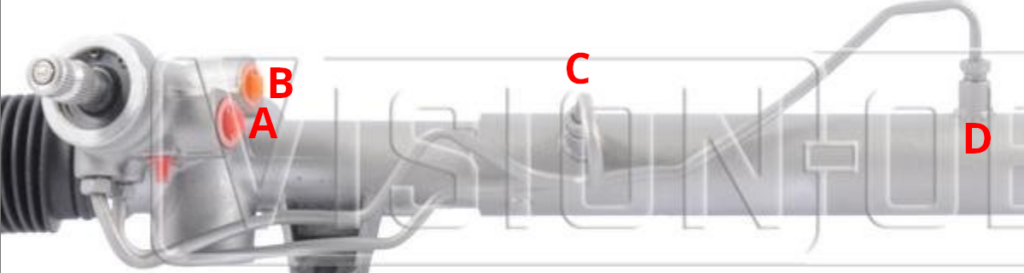 TRW racks have the lower pump line fitting (B) towards the front of the vehicle with the upper fitting (A) more to the center of the valve body. The lines from the valve body to the rack are not parallel, with the shorter line (C) on top and the longer line (D) facing more forward.