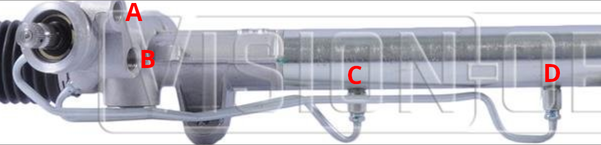 TRW racks have the lower pump line fitting (B) towards the front of the vehicle with the upper fitting (A) more to the center of the valve body. The lines from the valve body to the rack are not parallel, with the shorter line (C) on top and the longer line (D) facing more forward.